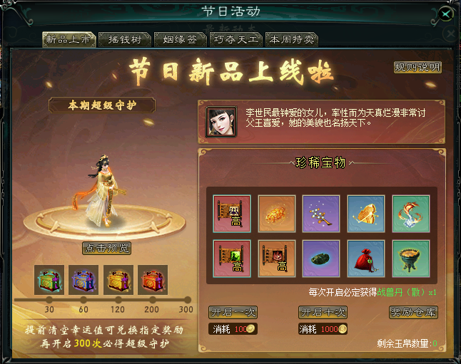 (2)玩家可消耗幸运币开启节日新品获得奖励,在开启时自动将玉帛消耗转换为幸运币,玉帛与幸运币的比例为1:1。