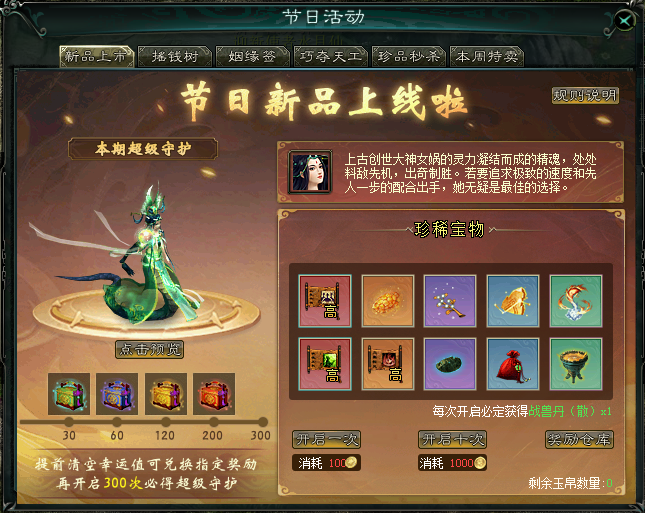 (3)每次开启均有机会额外获得超级守护(约0.3%),幸运值满必得超级守护。抽中物品时幸运值+1,抽中超级守护时幸运值清空。玩家可通过主动提前清空幸运值兑换包含高级武侯图,超级守护蛋在内的珍稀奖励。