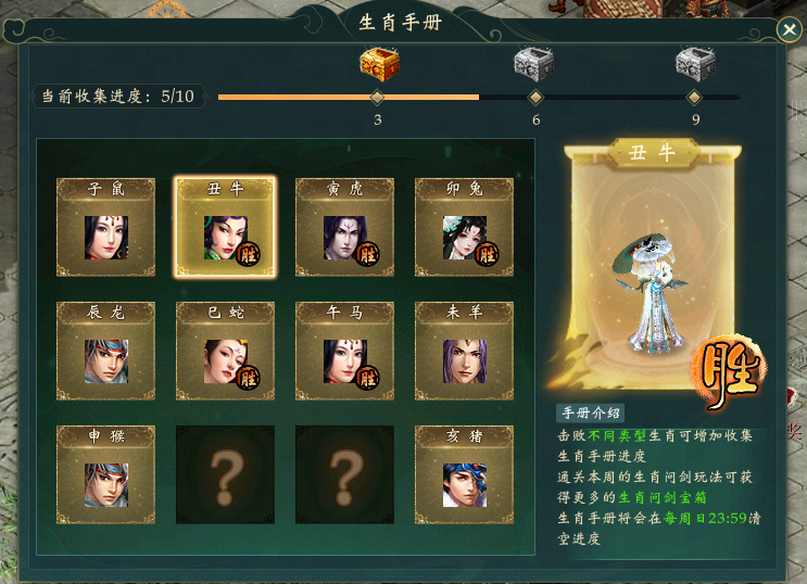 ④生肖手册收集进度达到3/6/9时,完成本周生肖问剑6关的挑战后,将通过邮箱额外发放1/2/3个生肖问剑宝箱;