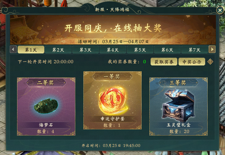 玩法说明:每天完成任务可获得天降鸿福奖券,拥有奖券的玩家可在当天20:00-21:30参与天降鸿福抽大奖活动,有机会获得超级守护蛋、限定时装礼包等好礼,活动期间每天19:45-21:45在线可享受经验雨奖励。
