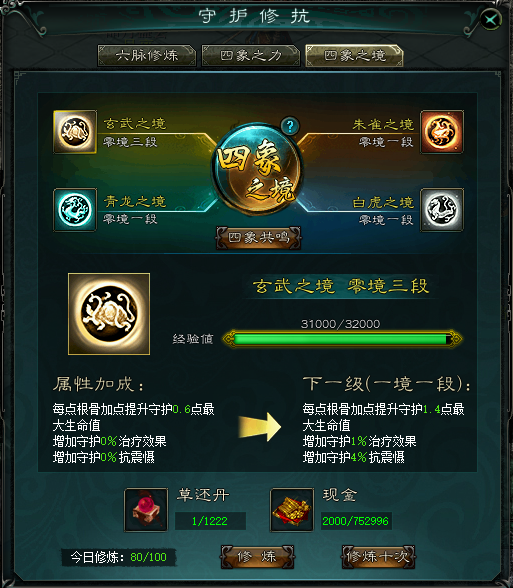 (1)阶段突破:消耗草还丹修炼获取经验,经验满后可用四象之灵突破阶段;阶段提升会根据守护加点提供额外属性加成。