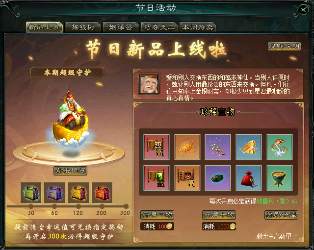 (3)每次开启均有机会额外获得超级守护(约0.3%),幸运值满必得超级守护。抽中物品时幸运值+1,抽中超级守护时幸运值清空。玩家可通过主动提前清空幸运值兑换包含高级武侯图,超级守护蛋在内的珍稀奖励。